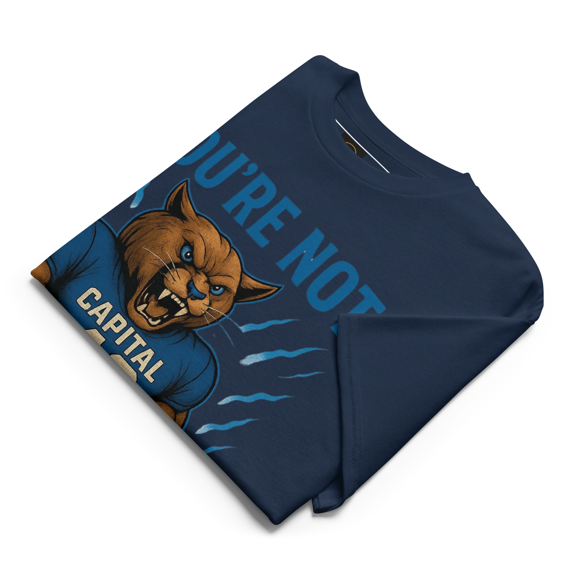This bold design features a fierce cougar in full football gear, roaring with intensity and power. The words “YOU’RE NOT BUILT FOR THIS” make a strong statement, showing confidence, toughness, and a never-back-down attitude. With “CAPITAL 40” proudly displayed, it represents the heart, strength, and pride of Capital High.