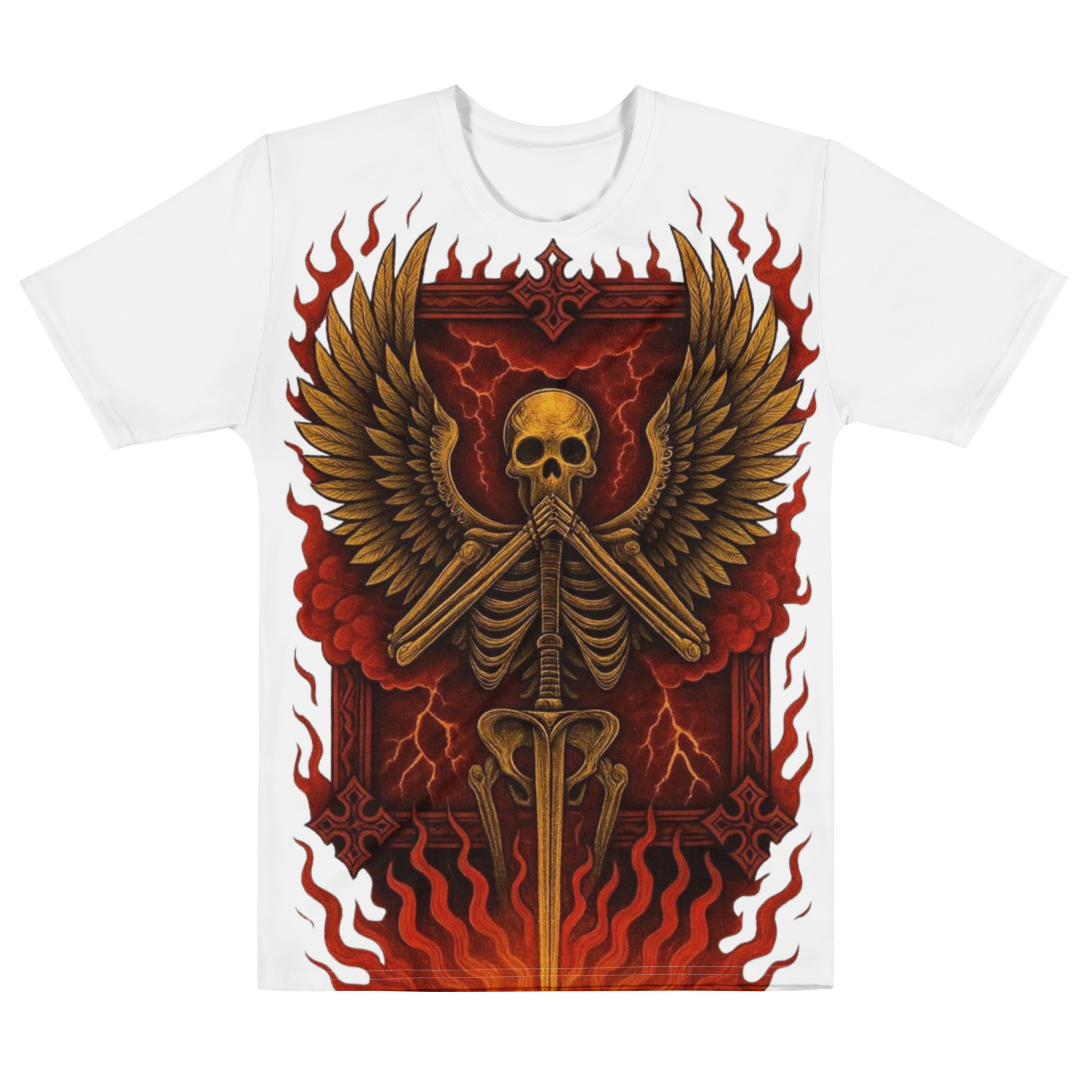 This striking all-over print tee features a gold-winged skeleton standing over a blazing sword, hands crossed in silence over its mouth, an image of mystery, power, and restraint. Surrounded by flames and red lightning, the design symbolizes a quiet force that speaks volumes without a word. For those who’ve been through fire and still stand tall, this shirt is a bold statement of strength, transformation, and inner control. Available in all sizes.