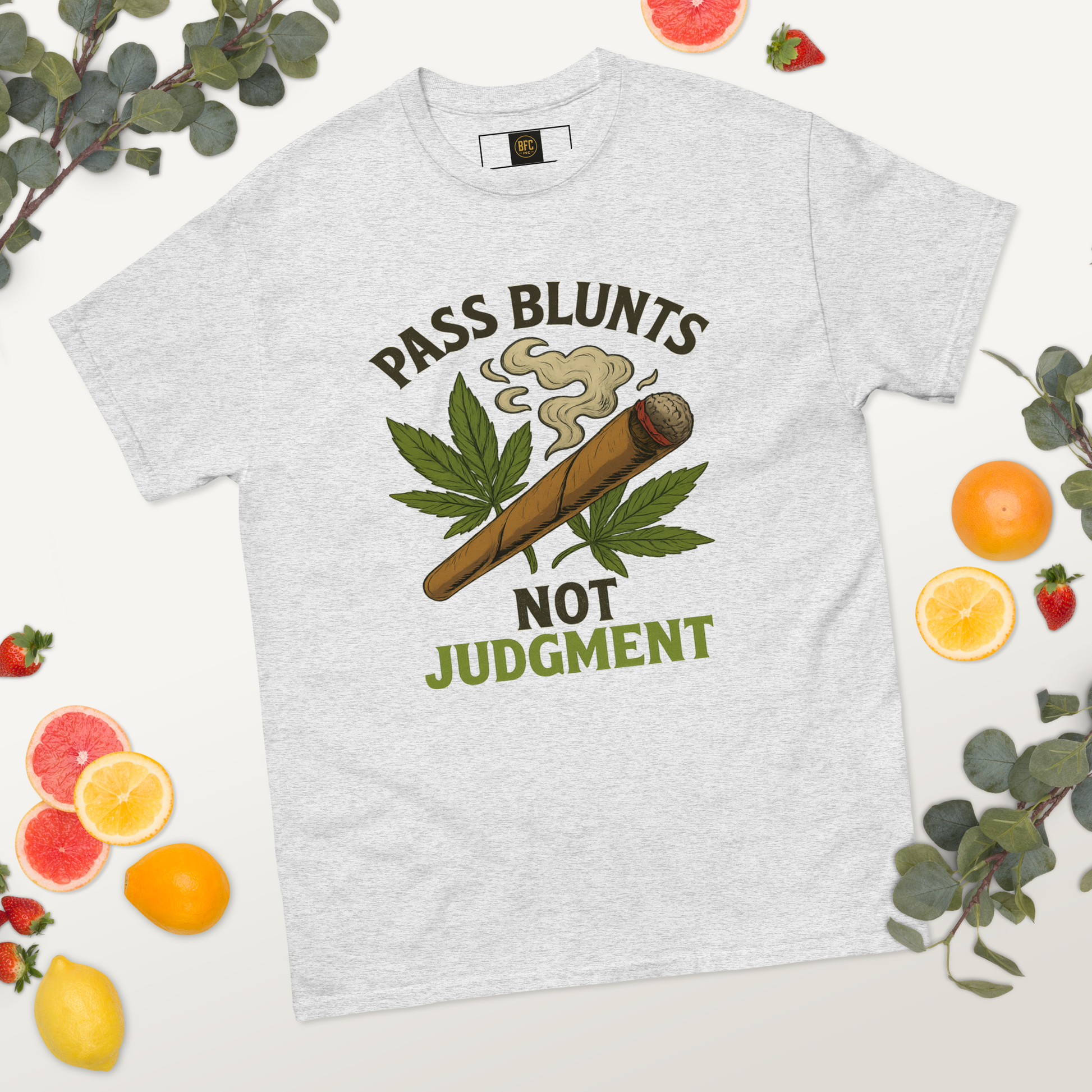 Pass Blunts, Not Judgement – Bold Cotton Cannabis Lifestyle Shirt, 420 Streetwear Graphic Tee, Weed Advocacy Urban Apparel with Stoner Humor