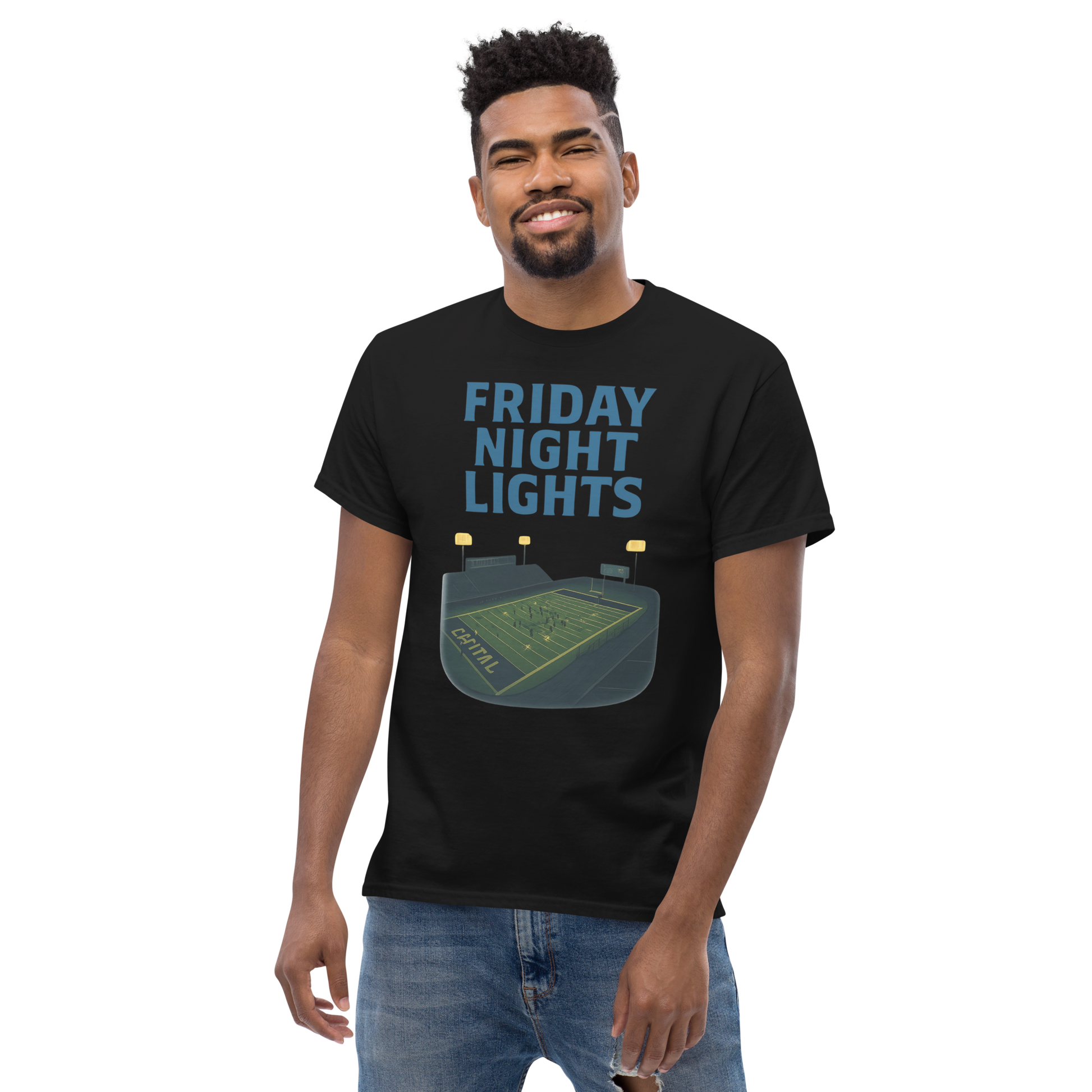 FRIDAY NIGHT LIGHTS ENERGY – Features a glowing football stadium under the lights, capturing the intensity, excitement, and spirit of Capital High game night.