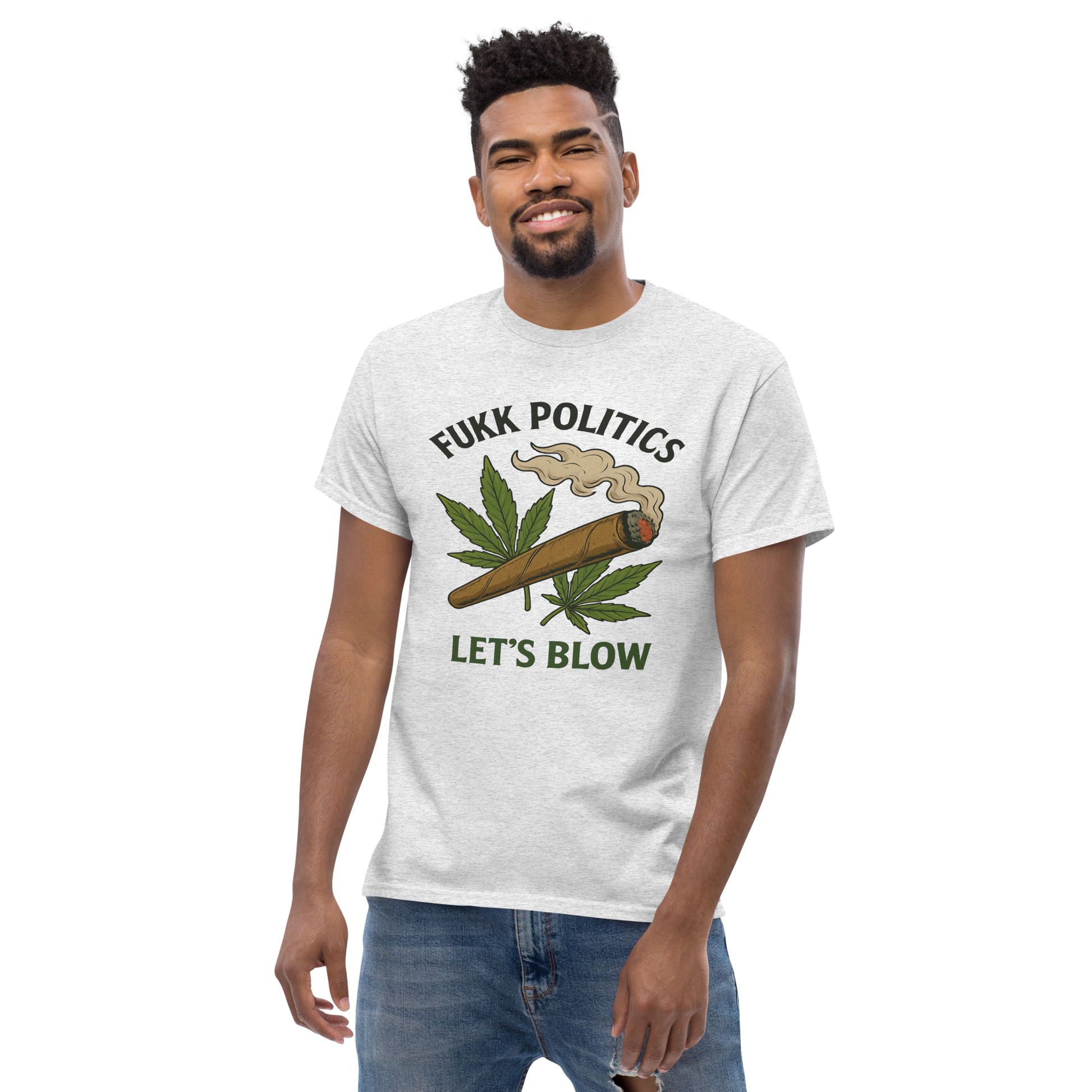 LOUD MESSAGE, LAID-BACK VIBES – Features the unapologetic phrase “Fukk Politics, Let’s Blow” wrapped in a blunt-and-smoke design because peace > politics. A bold cannabis expression tee for those who rep high vibes and freedom.