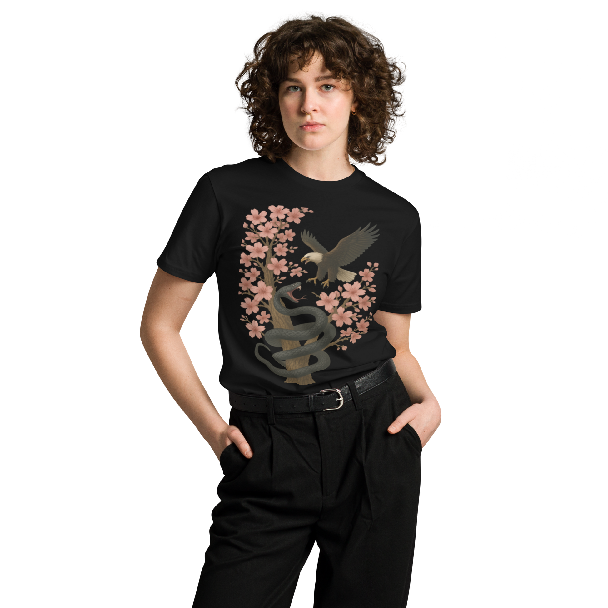 SYMBOLISM THAT SPEAKS TO THE SOUL – Features a black serpent entwined with pink blossoms, facing an eagle, an artistic portrayal of wisdom, transformation, and inner strength. A standout serpent wisdom graphic tee and black gothic nature shirt in one.